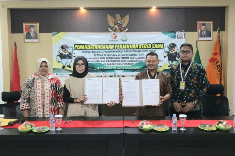 BELITUNG TIMUR, TIMELINES.ID — Badan Pengawas Pemilihan Umum (Bawaslu) Kabupaten Belitung Timur (Beltim) dan Kejaksaan Negeri Belitung Timur menandatangani Nota Kesepahaman atau Memorandum of Understanding (MoU) terkait kerja sama bidang Hukum Perdata dan Tata Usaha Negara pada pelaksanaan pemilihan Gubernur dan Wakil Gubernur, Bupati dan Wakil Bupati di Kabupaten Beltim.