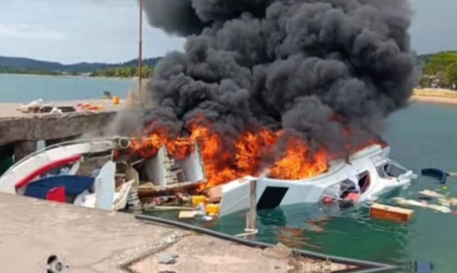 Terpisah, Speed boat yang ditumpangi rombongan pasangan calon gubernur Maluku Utara, Benny Laos-Sabrin Sehe terbakar saat sedang berlabuh di pelabuhan regional Bobong, Desa Bobong, Kecamatan Taliabu Barat, Kabupaten Pulau Taliabu.