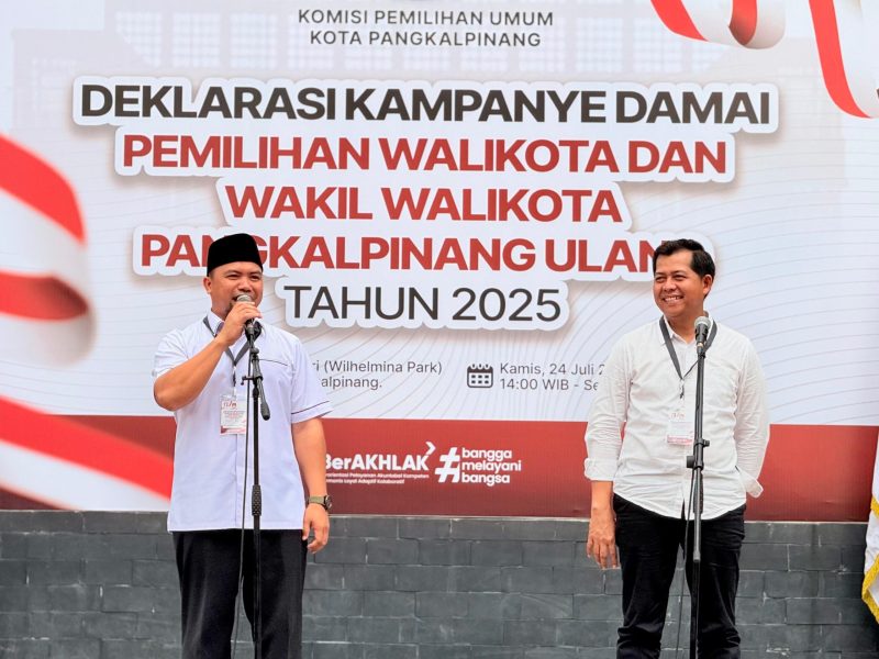 PANGKALPINANG, TIMELINES.ID – Pasangan calon wali kota dan calon wakil wali kota nomor urut 4, Basit Cinda-Dede Purnama Alzulami menghadiri Deklarasi Kampanye Damai Pilkada Ulang Kota Pangkalpinang 2025, di Taman Wilhelmina, Tamansari, Pangkalpinang, Kamis, 24 Juli 2025.