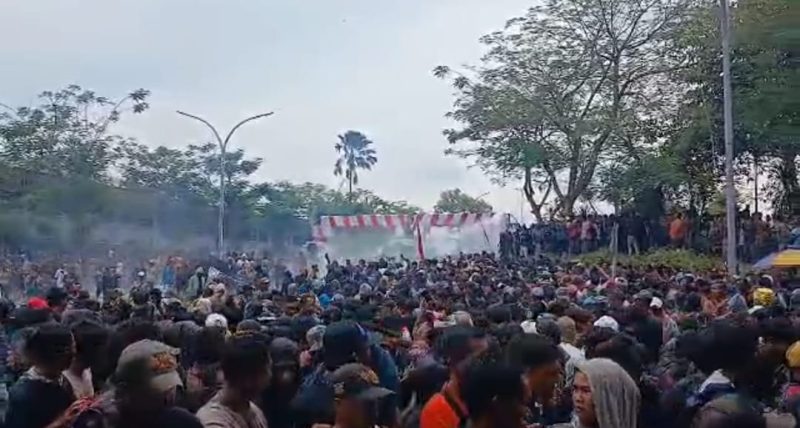 Ribuan massa berusaha masuk ke dalam kawasan Kantor PT Timah. Sementara ratusan personel polisi memblokade menahan para pendemo.
